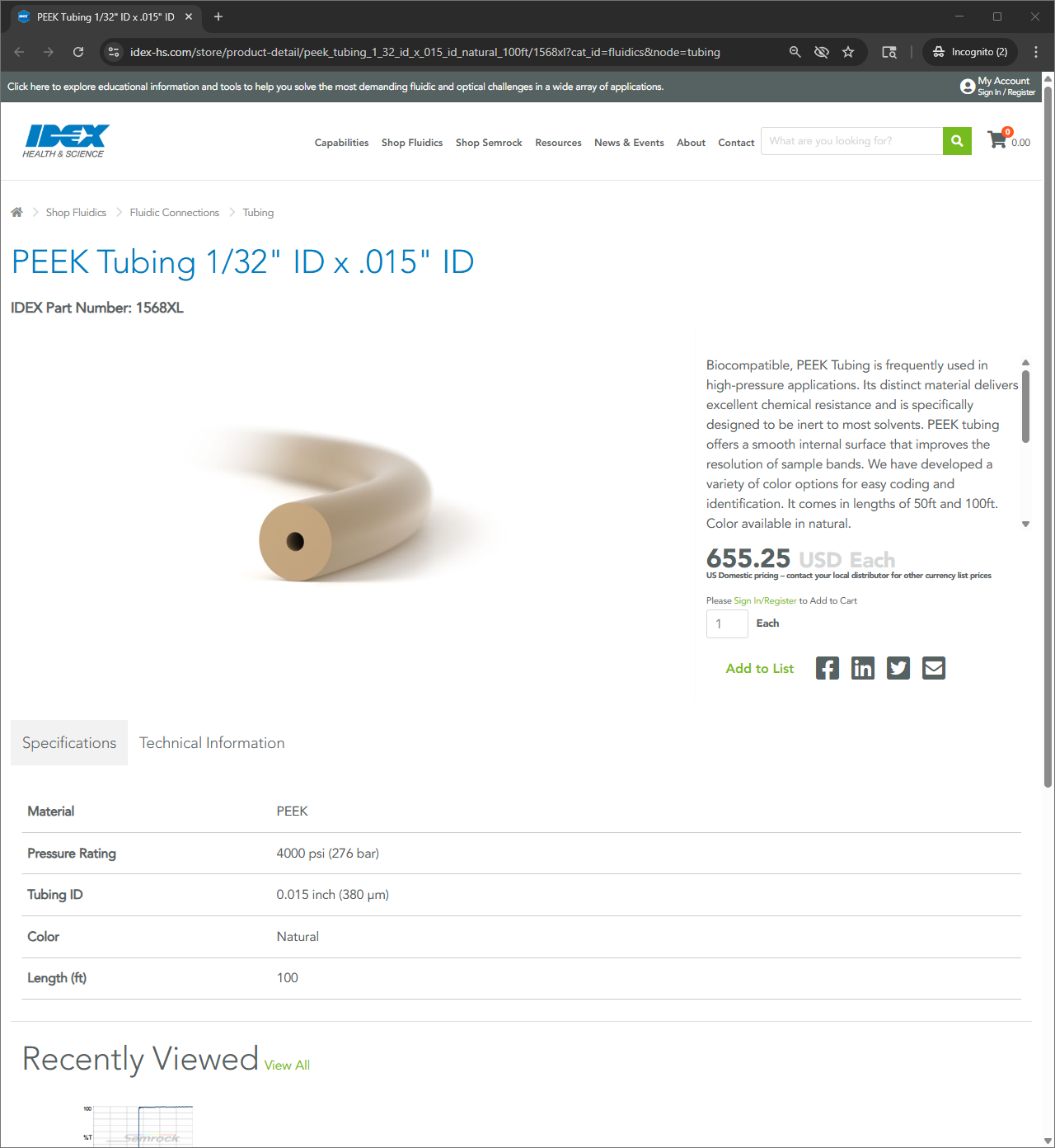 In general the PTFE tubing (1) is preferable for many applications due to it's lower cost, excellent chemical resistance and higher water contact angle which results in more accurate dispenses (especially for 'sticky' liquids). However, the PEEK tubing (2) is a solid backup with greater stiffness, strength and wear resistance, and is typically made to tight tolerance. Both materials can operate at high temperatures (~260°C).