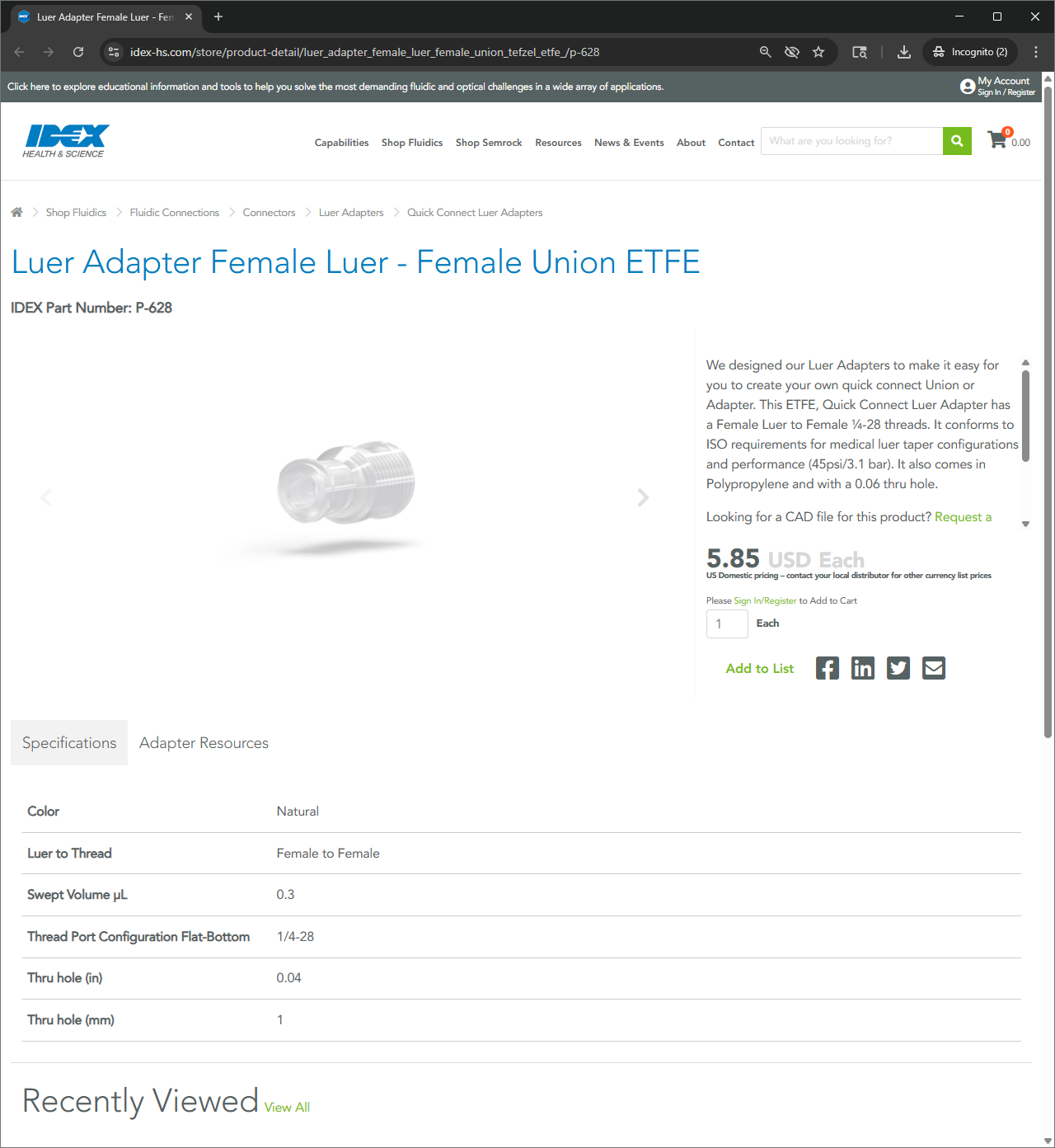 We use a Luer adaptor (IDEX P-648), ferrule (IDEX P-248X) and nut (IDEX P-255) to make a reliable connection between the delivery tube and the syringe. Simply slide the parts onto the delivery tube and firmly tighten the nut onto the Luer adaptor with fingers (Figure A1).